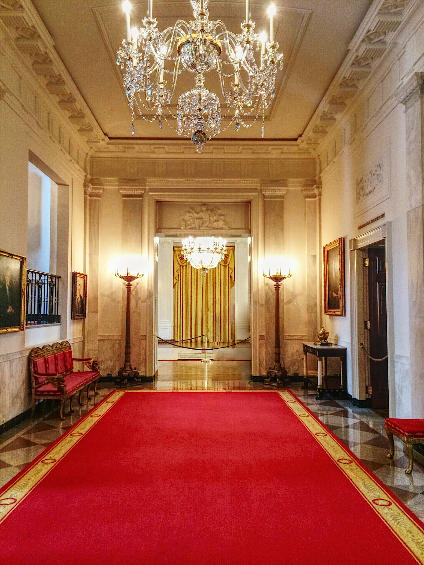 The Cross Hall has one door each leading to the Green Room, Blue Room, and Red Room, respectively. Although they are open during actual tours, visitors cannot pass through them.