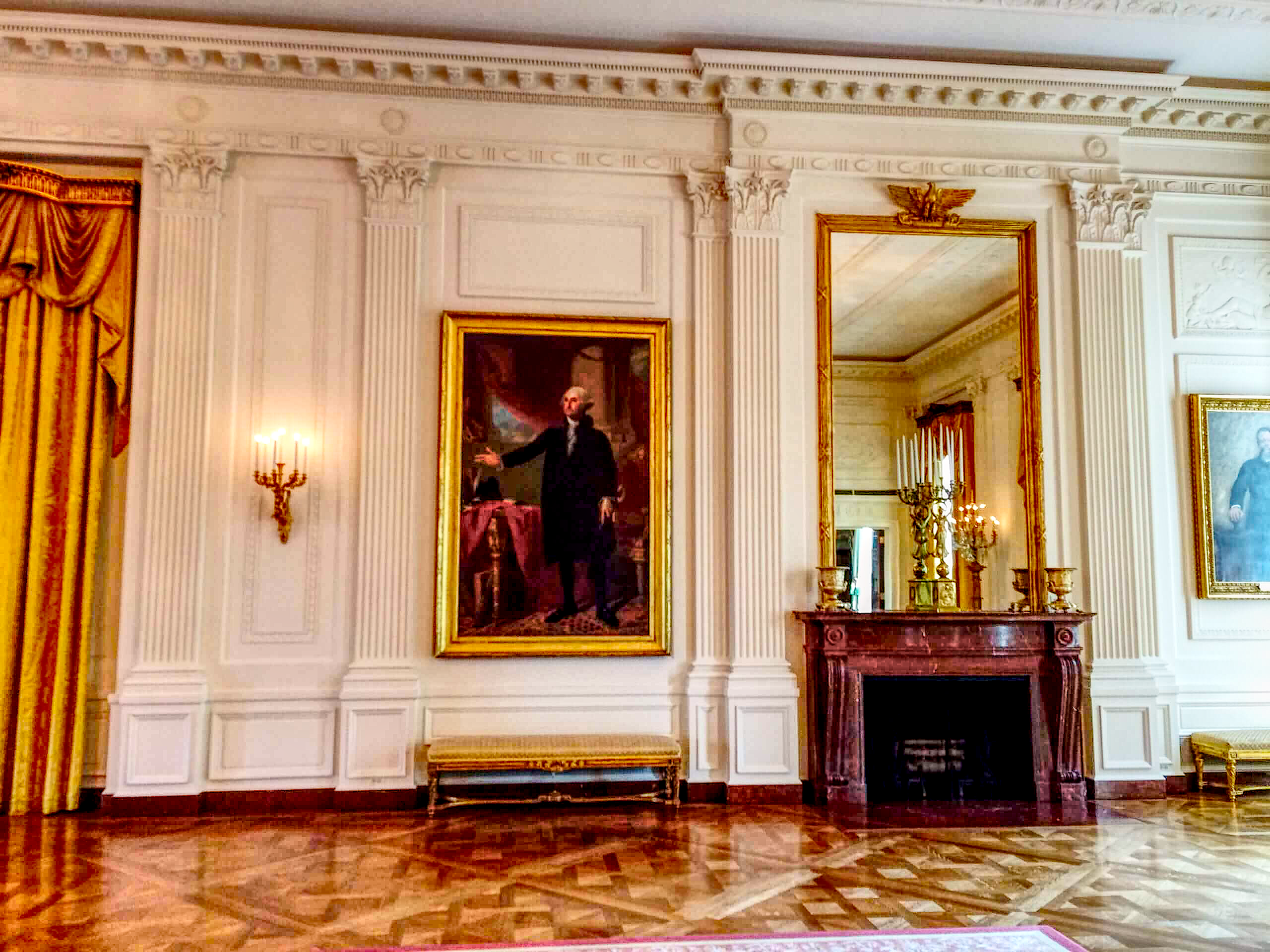 On the east wall of the East Room, there are golden curtains that cover the windows in the center. To the right are portraits of the first President, George Washington, and to the left is a portrait of his wife, Martha Dandridge Custis Washington. Sandwiched between them are portraits of the 26th President, Theodore Roosevelt, to the south, and the 25th President, William McKinley, to the north.
