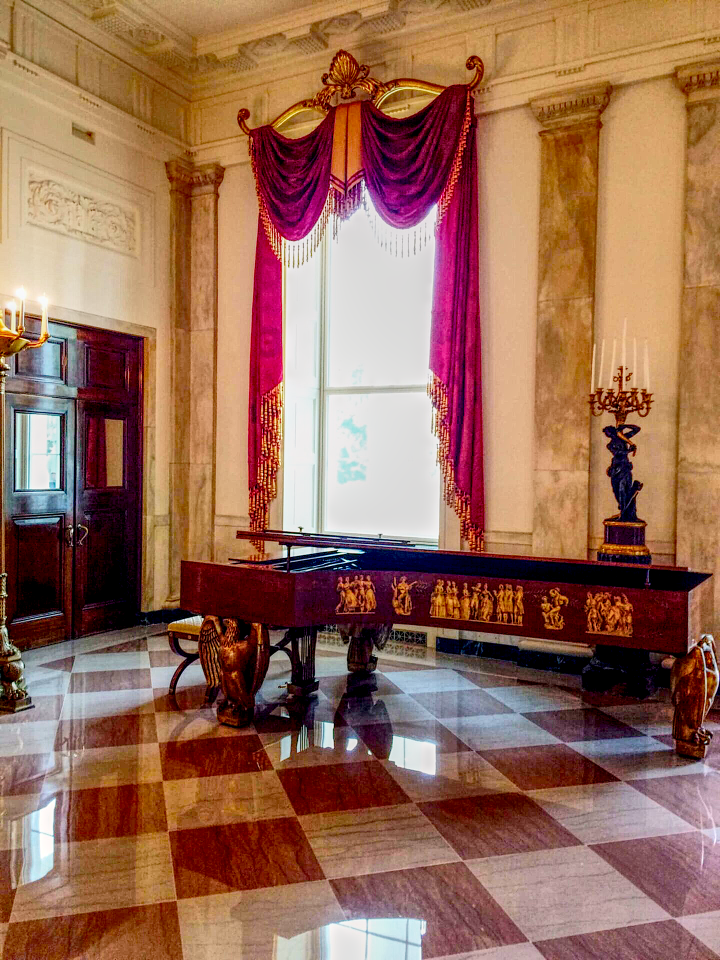 In this hall, a Steinway & Sons grand piano, specially made for the White House, is placed. On the east side, there is an impressive grand staircase reminiscent of a ballroom, adorned with a red carpet.