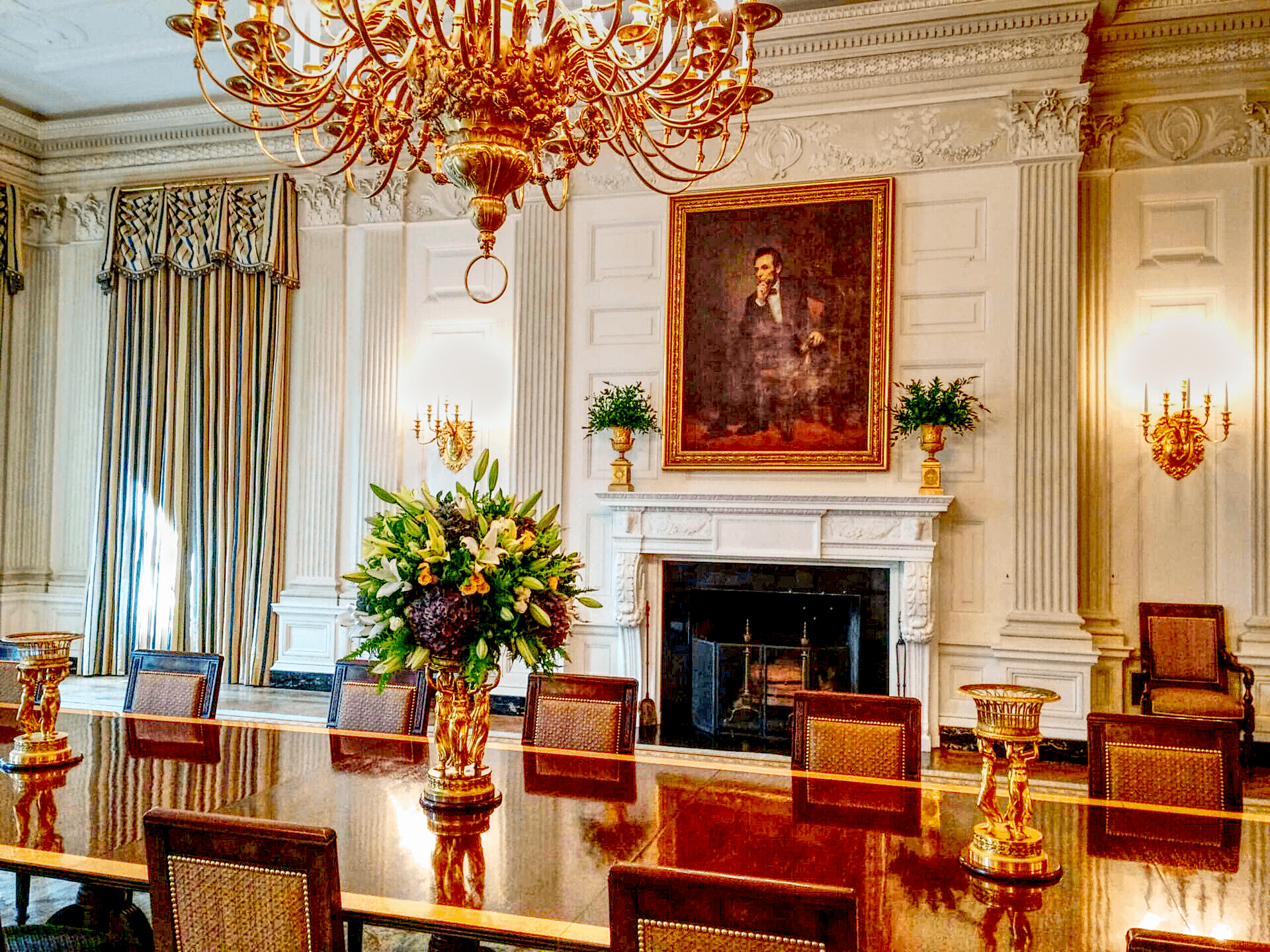 The State Dining Room is full of captivating features, from the chandeliers, carpets, and curtains to the overall interior design. But I highly recommend you do not miss the fireplace, which carries the timeless words of remarkable Presidents that touch the heart across generations.