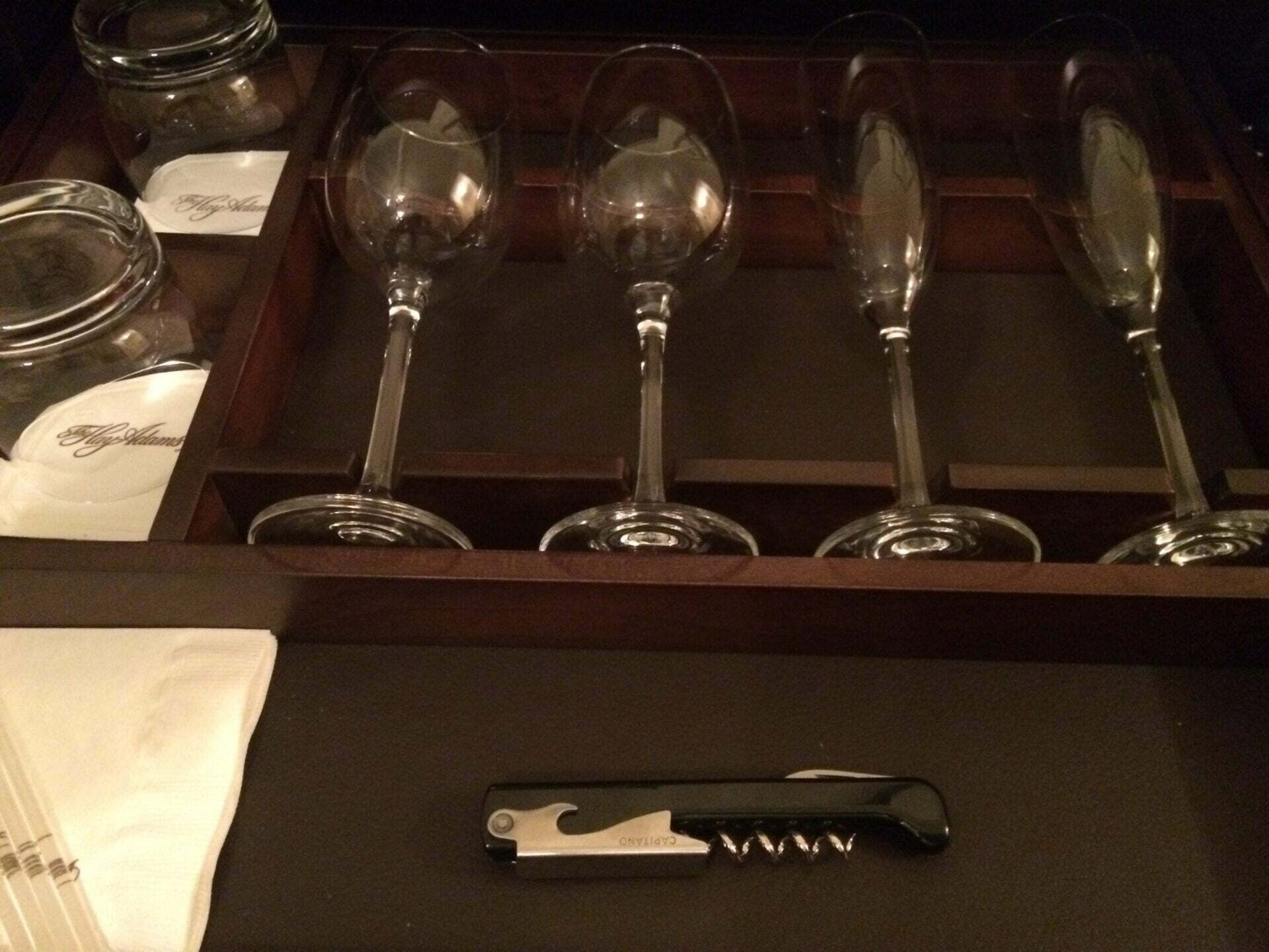 日本のホテルでは3スタークラスでも見かけることがあるミニバーですが、海外のホテルでは基本的にありません。ヘイ・アダムスでは全室共通でミニバーとスナック菓子が備え付けられていて、ちょっとしたおやつや喉が乾いた時などに利用することができます。ただし、商品をとった時点で課金されてしまいますので、利用する時は気をつけましょう。なお、その点についてはさすが5スターホテル、冷蔵庫の扉のところに日本語でも表記されています。