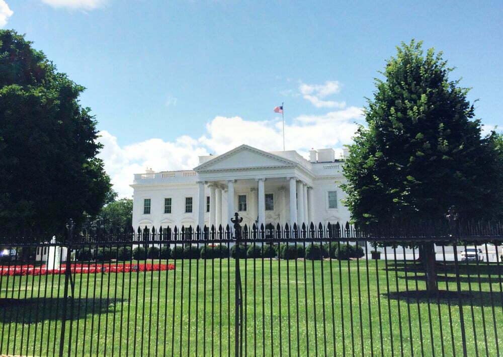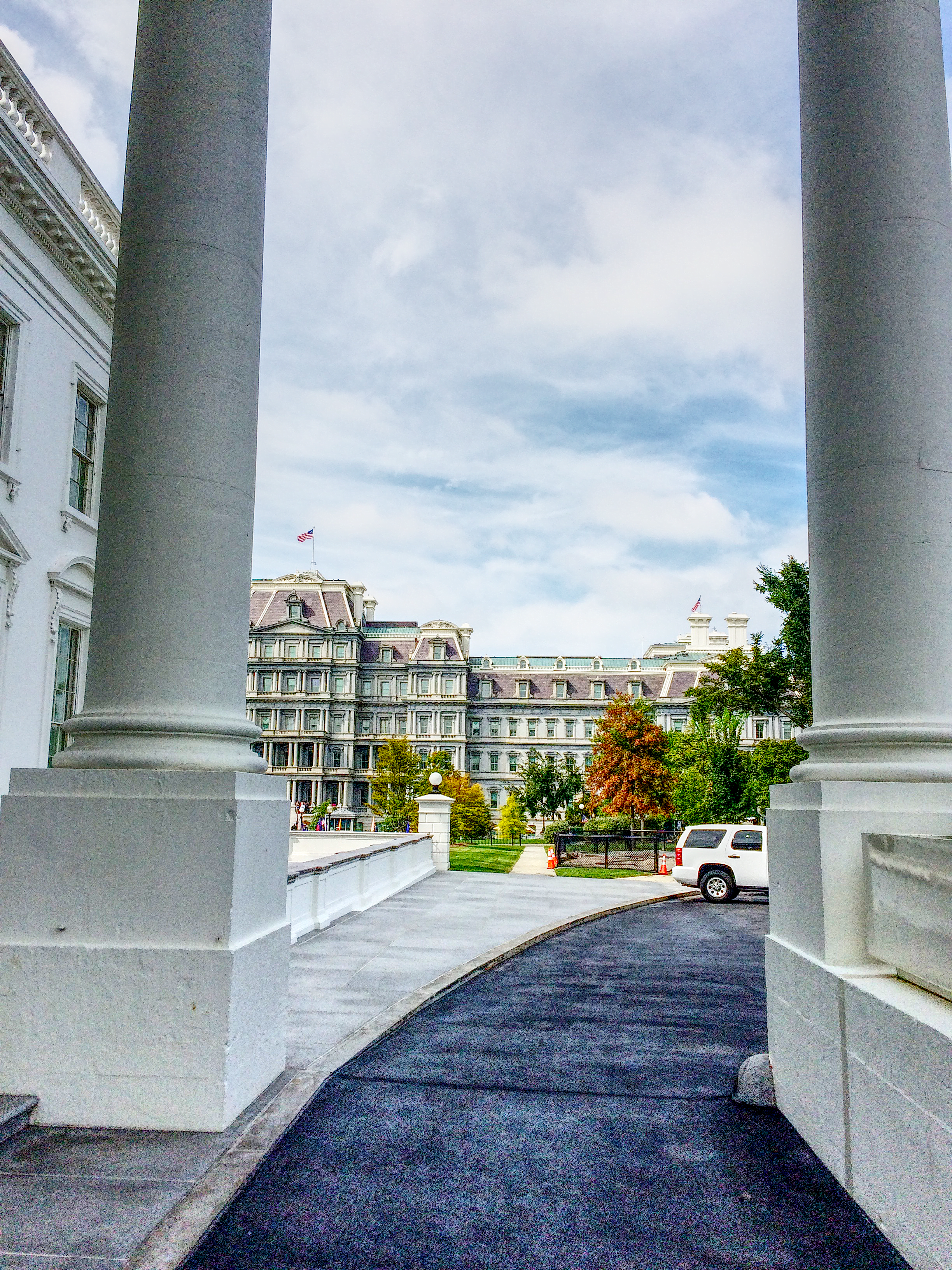 北ポルティコを背に一歩玄関を出れば、目の前には美しく整備された緑地が広がっています。左の奥にはアイゼンハワー行政府ビルが見え、正面にはペンシルヴェニア通りとラファイエット広場が見えます。