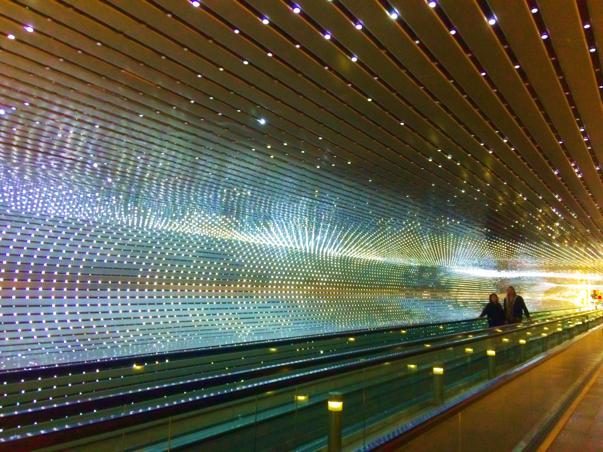 西館側から東館へ足を運ぶと、まぶしいほど明るい光のトンネルが私たちを出迎えてくれます。トンネルを抜けると、ガラス越しに自然の光が差し込む空間に差し掛かり、訪れる人のワクワク感を高めてくれます。