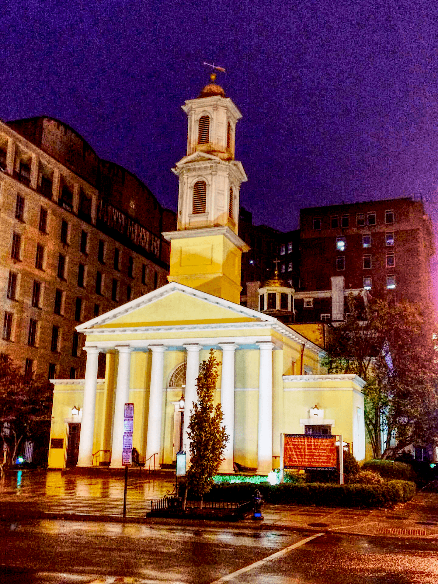 セント・ジョンズ教会はホワイトハウスの北にあるラファイエット広場からH通りを挟んで北側、16番通りの東側のブロックにあります。この一帯には高級ホテルとして知られるヘイ・アダムズや行政府ビルなどが建ち並び、伝統と格式を感じられる場所になっています。