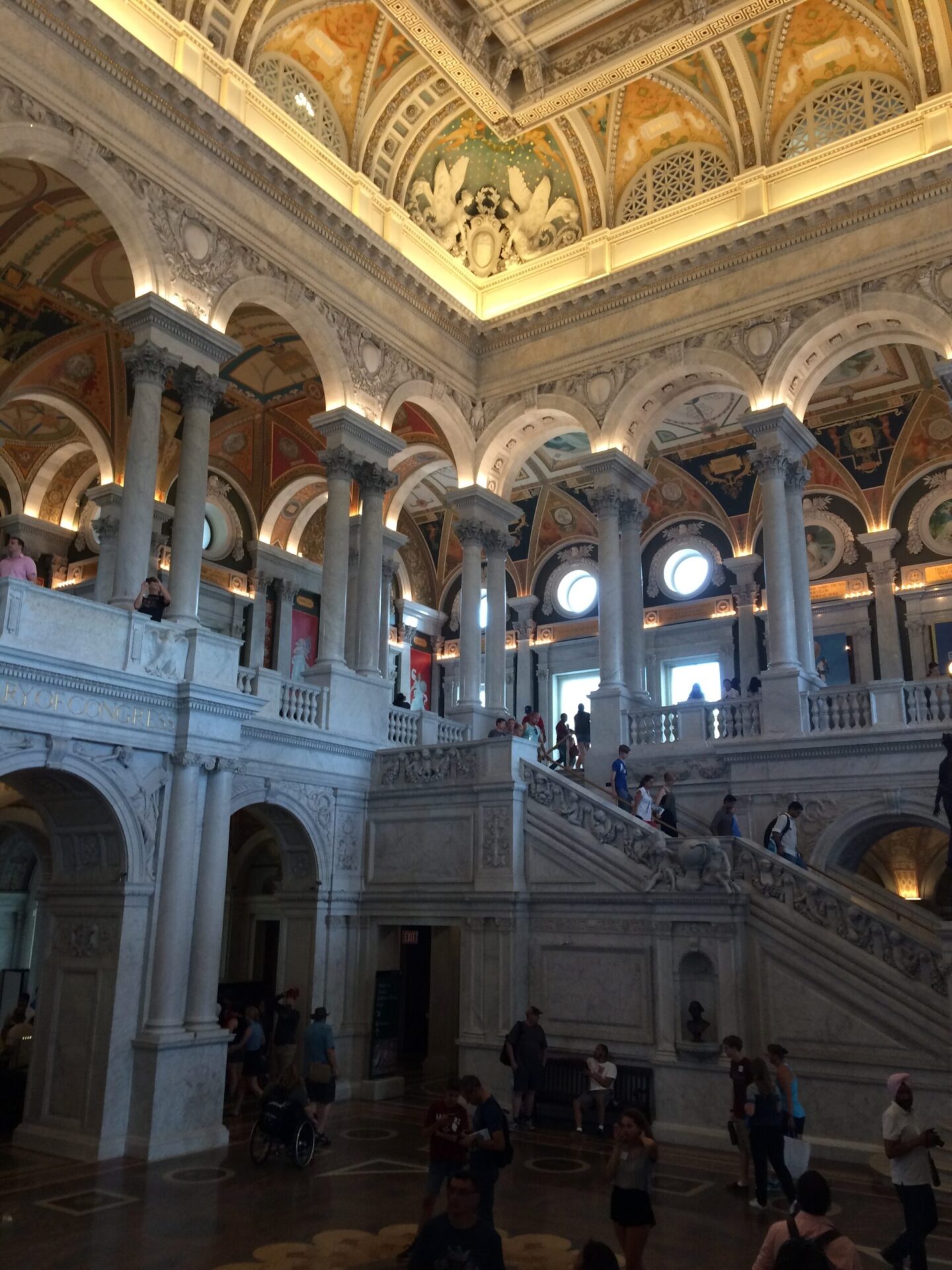 メインホールには南北に1対の大階段が設けられていて、来館者は自由に行き来できます。ホール2階の奥にはさらに階段があって奥に進むと巨大な八角形の広間に出ます。そこはメインの閲覧室で壁には議会図書館が誇る数々の書物が収められています。